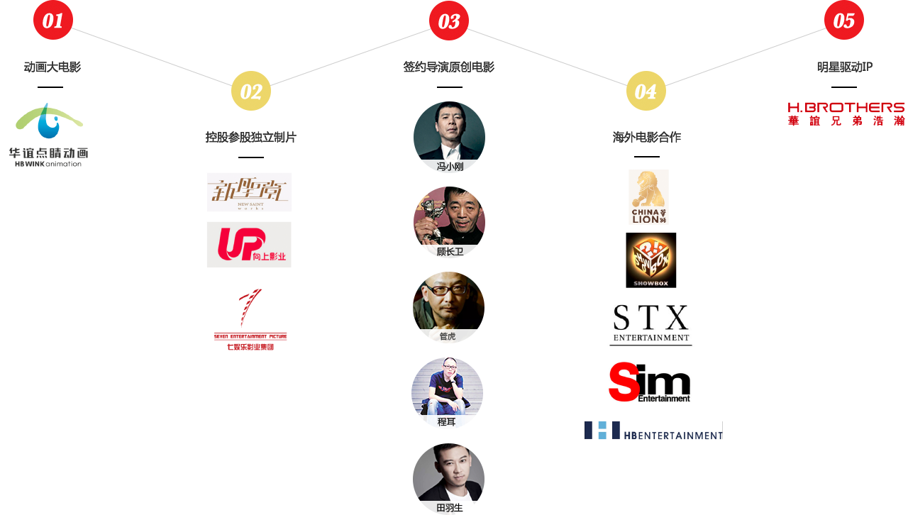 浩瀚娱乐、博天堂918(中国区)官网网站聚星、东阳美拉和博天堂918(中国区)官网网站点睛动画等;以及产量、品质都非常稳定的签约导演团队,如冯小刚、管虎、程耳和田羽生等等。